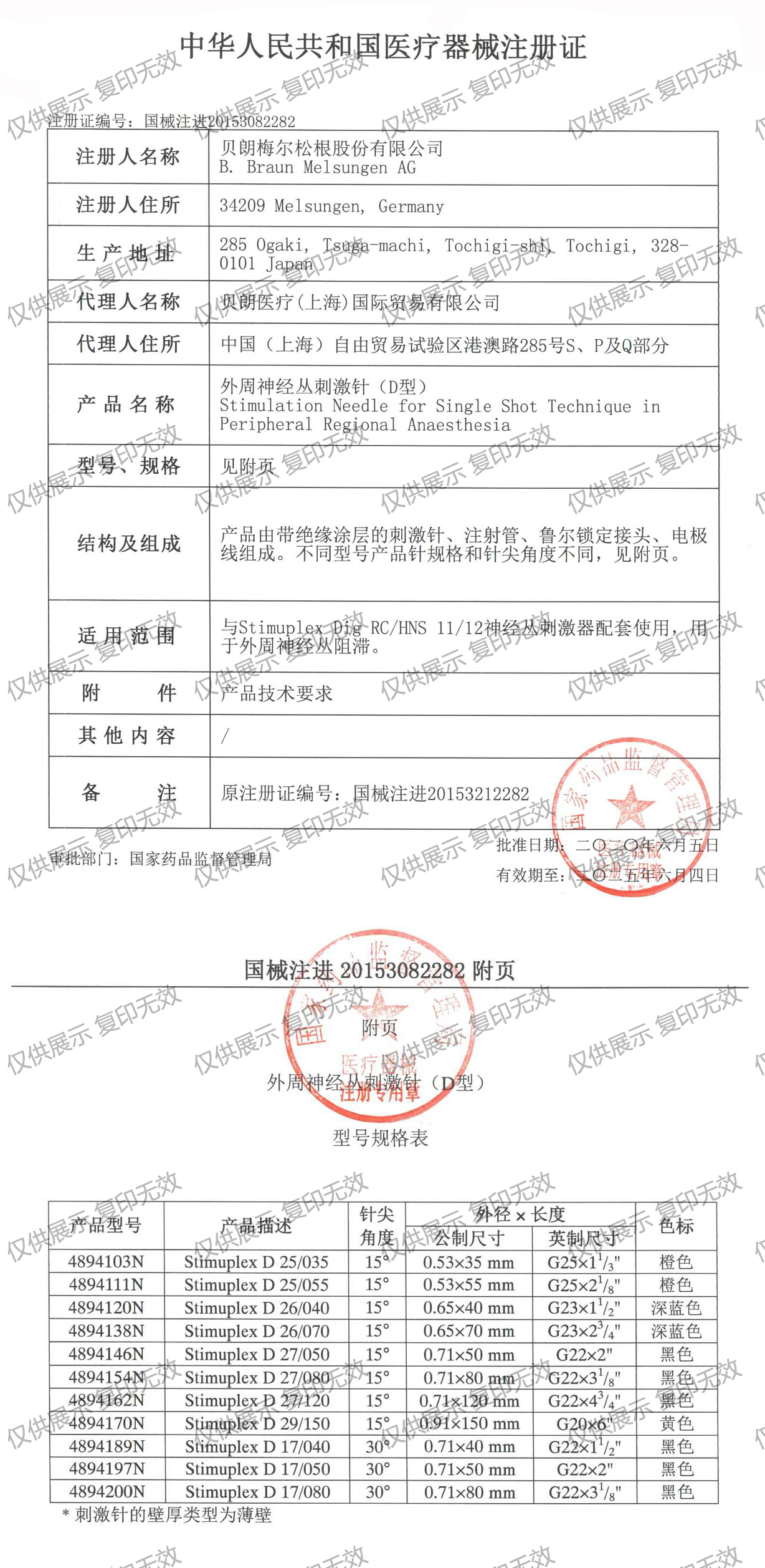 適用范圍:與Stimuplex Dig RC/HNS 11/12神經(jīng)叢刺激器配套使用,用于外周神經(jīng)叢阻滯。
